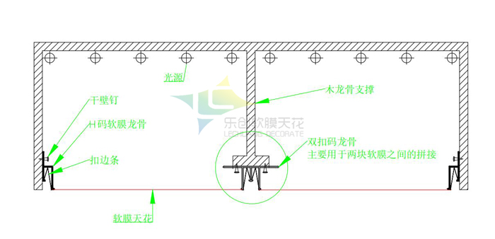 軟膜天花可以大面積安裝,最寬可以做5米不拼接,但由于其材料本身的柔韌性,存在一定的下垂,所以大面積安裝我們一般建議分塊安裝,下面給大家介紹一下分塊安裝的具體結(jié)構(gòu)。 大面積軟膜分塊安裝,根據(jù)客戶的實際需求,我們一般建議分塊在2米左右寬度的,這樣能有效的避免下垂,那具體如何分塊呢?往下看,如下圖所示,四周正常固定專用的h龍骨,中間采用專用的雙扣龍骨進行分割,中間支撐桿可以采用木龍骨或者其他材料都可以,需要注意的是支撐桿的高度要比四周高大約2.5公分,這個是為了方便雙扣龍骨安裝在下部位置以后和四周h龍骨齊平。